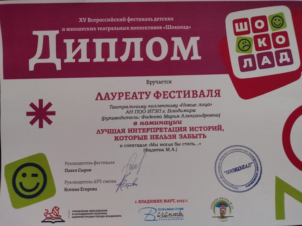 Театральная студия «Новые лица» под руководством Марии Александровны Фадеевой завоевала звание Лауреата на XV Всероссийском фестивале детских и юношеских театральных коллективов «Шоколад»!